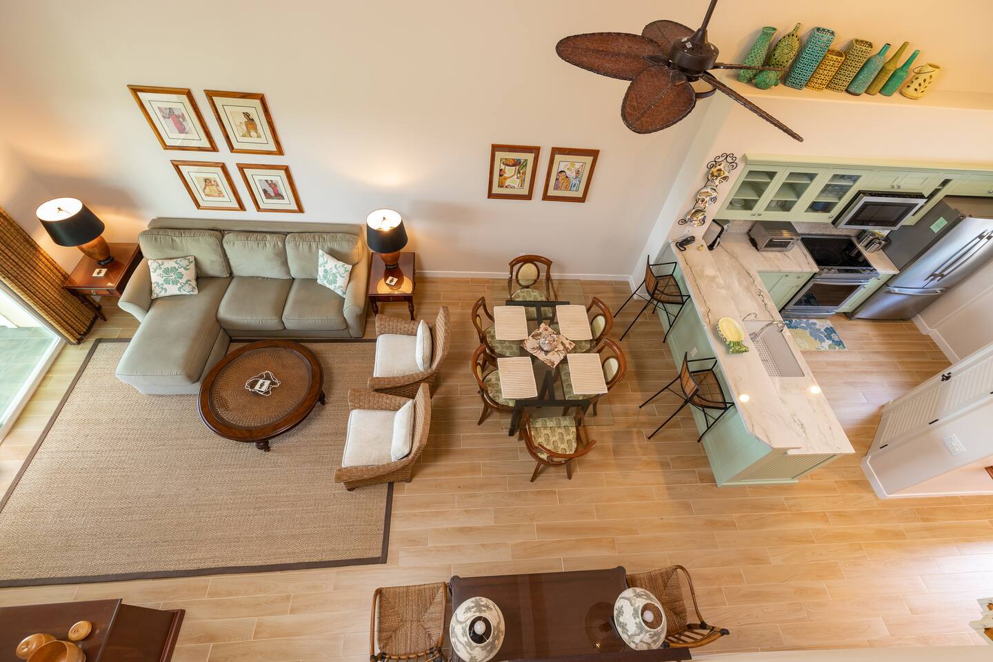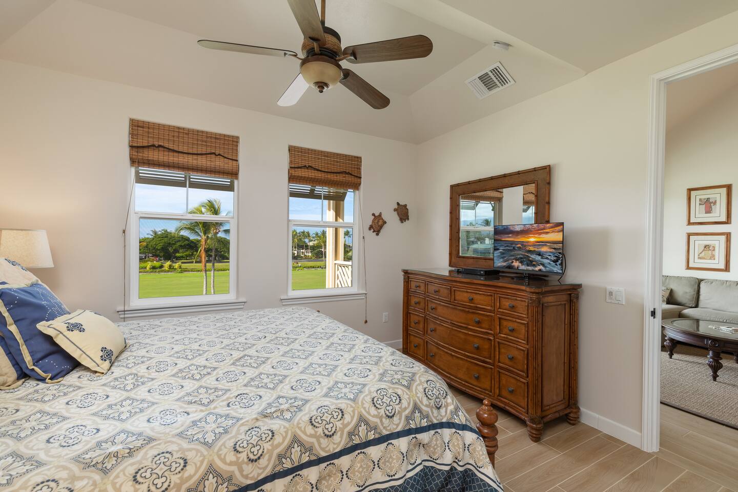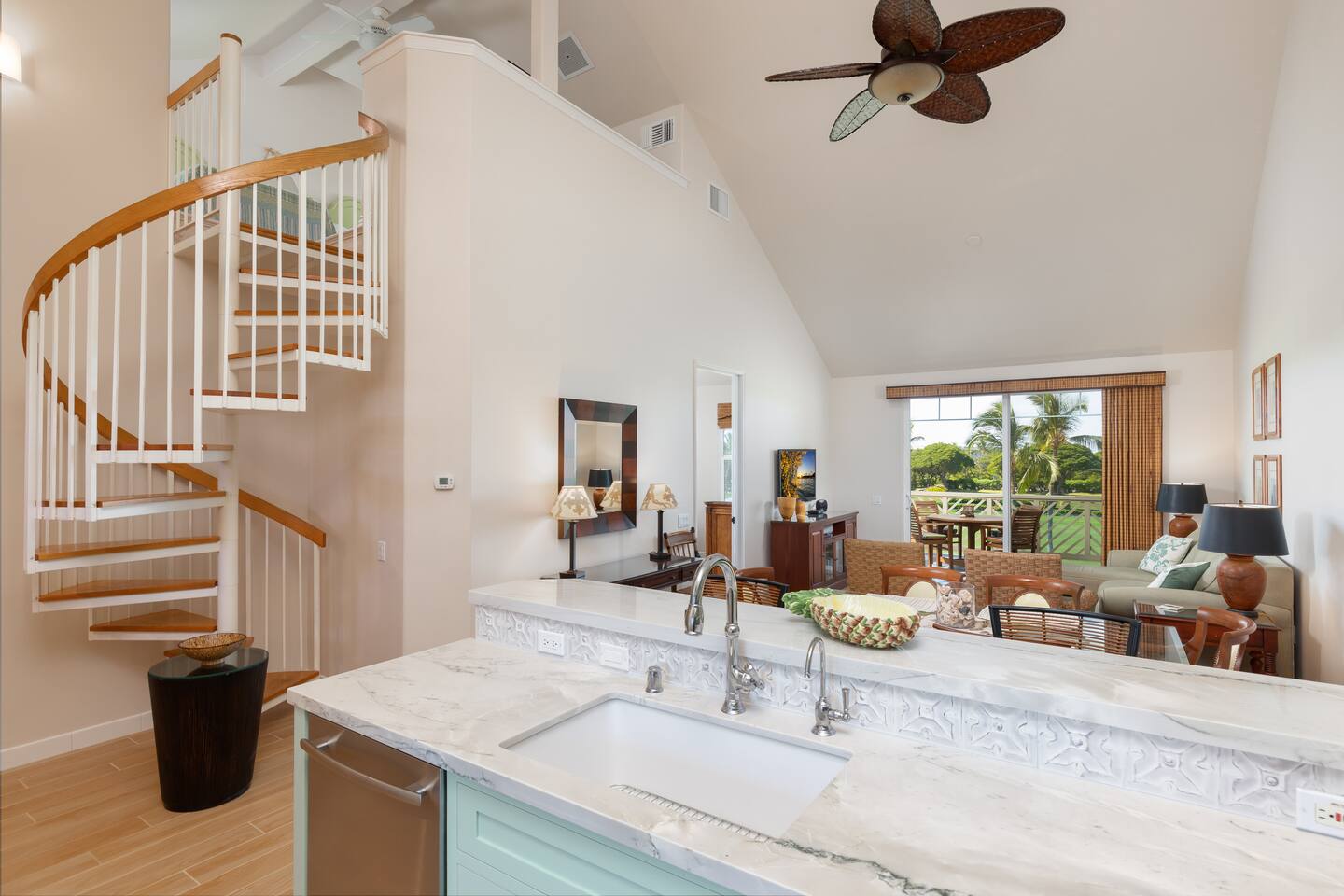 Welcome to our Beautiful Waikoloa Beach Condo-Penthouse with Discounted Gold Golf Membership & Fabulous Sunsets. This beautiful rental is a peaceful & quiet condominium (overlooking the 5th hole on the Beach Course, rated 18th nationally) and is within convenient walking distance to the majestic Anaeho’omalu Bay and the King Shops and Queen’s Marketplace shopping centers. Our Gold golf membership entitles you as our guests to play for a discounted golf rate at the King’s Course for ($60) and the Beach Course for $75 per person plus tax before 9:30 a.m. and $50 after 9:30 a.m. For non-golfers we are close to several magnificent beaches and restaurants as well as being just a short walk to the Marriot Resort Hotel and Beach Club and the Hilton Waikoloa Village Beach Resort & Hotel with its world class spa. Our unit is on the third floor and sleeps six comfortably. The upstairs loft is a perfect location for children. Our unit faces due west showcasing Hawaii’s most fabulous sunsets. We have wifi , as well as TVs in the living room and bedrooms and loft. We offer free local and long distance telephone, and a washer/dryer in the condo (a complete must while on vacation). The kitchen is fully equipped with all that you will need to cook within our unit including quartzside countertops plus stainless steel appliances and a microwave oven. Although you can walk to many fine restaurants in minutes, you have the option of easily cooking all meals in our condominium or on the large barbecue area next to the swimming pool. The Fairway Villas also has a fully equipped gym facility. There is a king size bed in the master bedroom, queen bed in the guest bedroom and two twin beds in the loft . There are two full bathrooms with bath tubs in both. Our Hawaiian getaway offers all of the comforts of home along with access to the treasures of our favorite island. A stay here may change your thinking about island hopping. Our prices include all fees. No hidden fees.